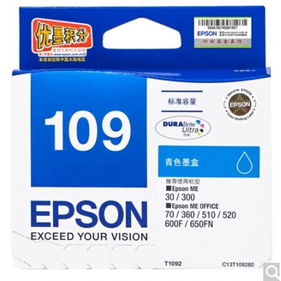 • 商品名称:爱普生(Epson)T1092青色墨盒 C13T109280(适用ME30/300/360/510/600F/650FN/700FW)